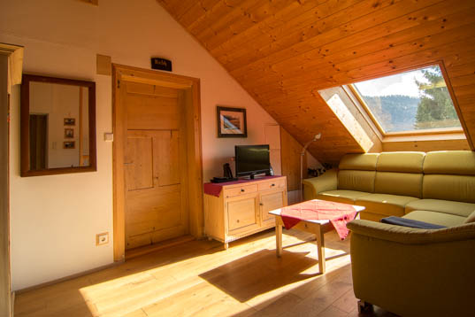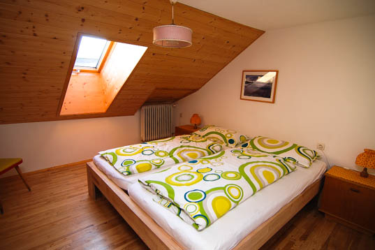 Das kleine Schlafzimmer mit südseitigem Dachfenster ist ein Zweibettzimmer mit 10 m² Größe.