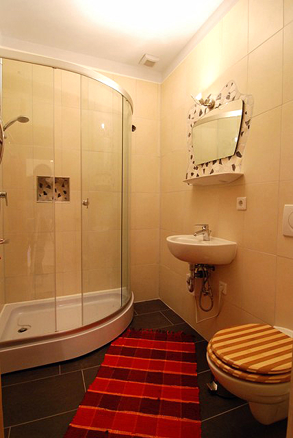 Die zwei aufwändig gestalteten Bäder sind ausgestattet mit Dusche, WC, Handwaschbecken, Föhn und Fußbodenheizung. Handtücher stehen zur Vergügung. |